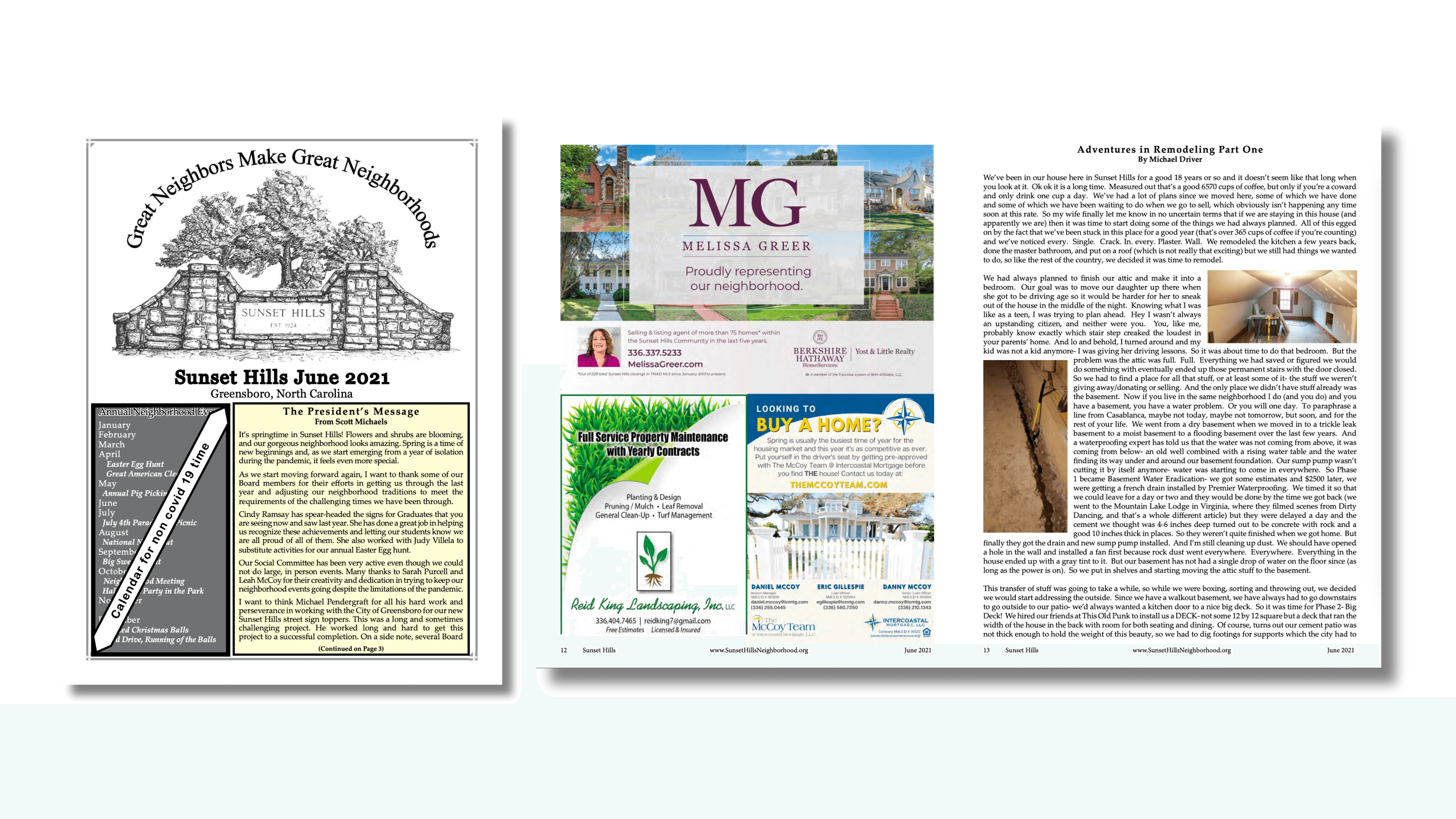 In 2022, I became the editor and designer for the Sunset Hills Neighborhood newsletter in Greensboro, NC. This 20+ page publication went to hundreds of homes locally and reached thousands in its online PDF form as well.